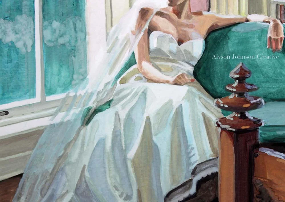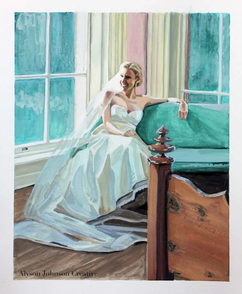 I took a sneaky iPhone pic while she was waiting for guests to arrive at the reception site, and the light fell beautifully on her dress. I used that shot as my inspiration to experiment with watercolor portraits.