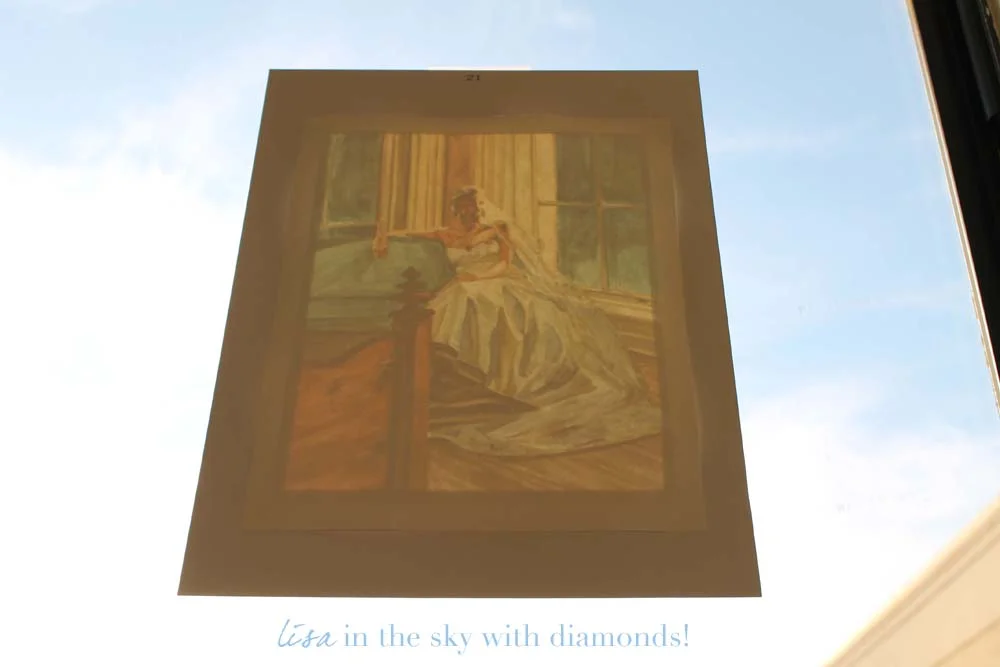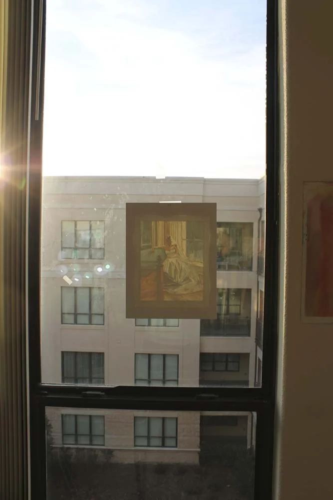 I put the mat up on the window, so I could see through it and align the painting and tape it to the back of the mat. The sun was setting just so, so that the painting glowed in reverse. I tried to take some photos because I just liked how it looked. The one below is silly. :)
